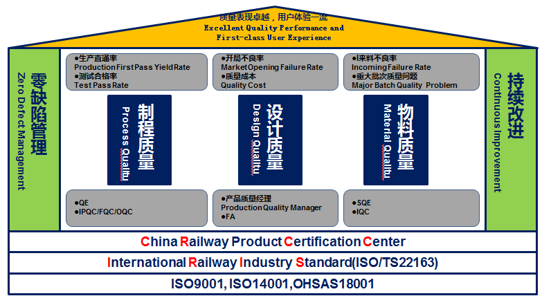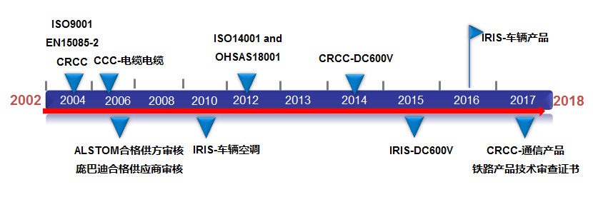 --公司通過(guò)了ISO9001質(zhì)量管理體系、ISO14001環(huán)境管理體系、ISO45001職業(yè)健康管理體系認(rèn)證,同時(shí)通過(guò)了國(guó)際鐵路行業(yè)質(zhì)量管理體系ISO/TS 22163(原IRIS)認(rèn)證以及中鐵檢驗(yàn)認(rèn)證中心CRCC認(rèn)證、EN15085焊接體系認(rèn)證、泰爾產(chǎn)品認(rèn)證、CE認(rèn)證、CQC自愿性產(chǎn)品認(rèn)證等。